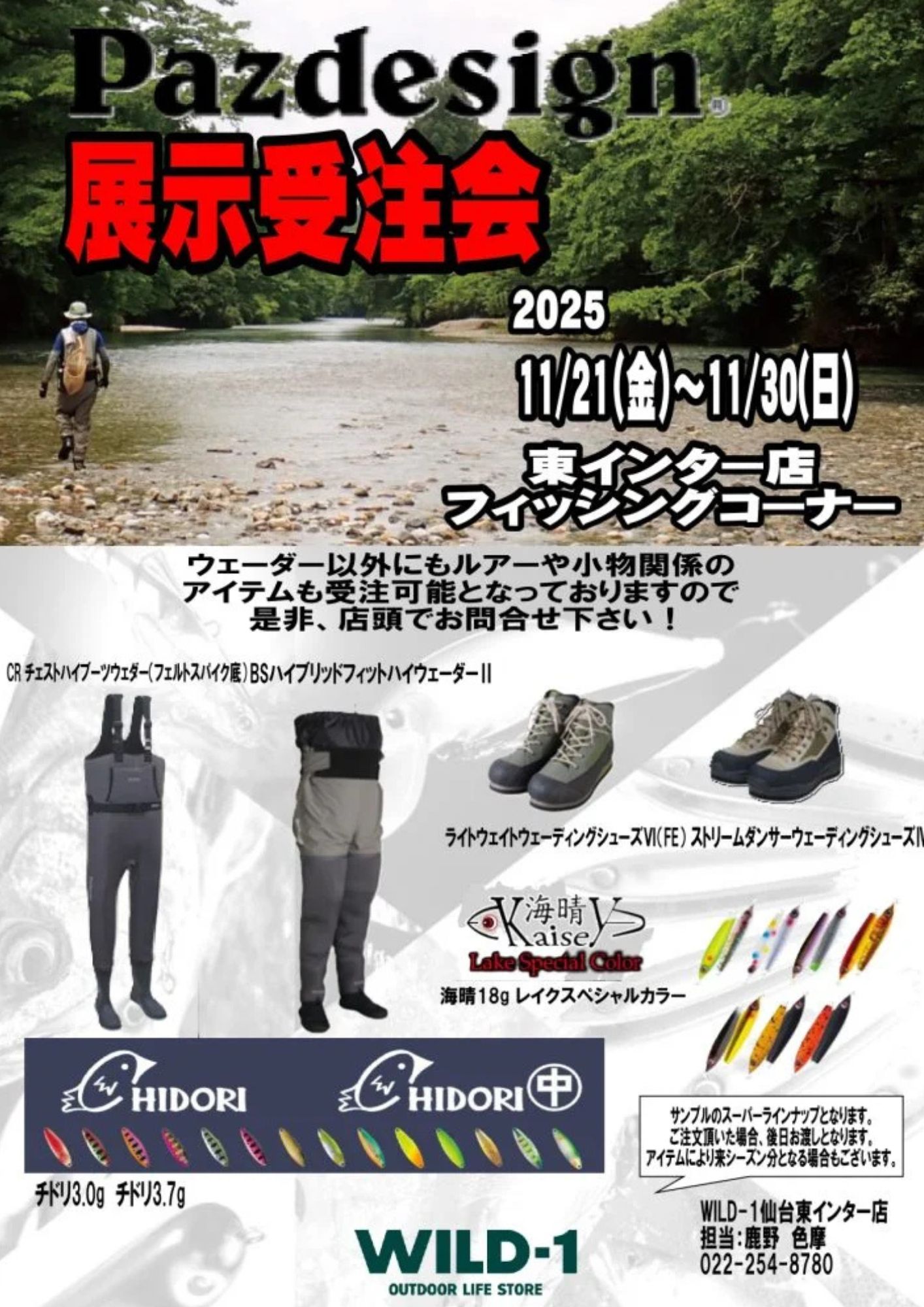 サクラマスシーズンを控えハイブリッドウェーダーやウェーディングウォームジャケットなどの防寒ウェアに加え、海晴レイクSPやCHIDORIの新色などを展示予定です!!