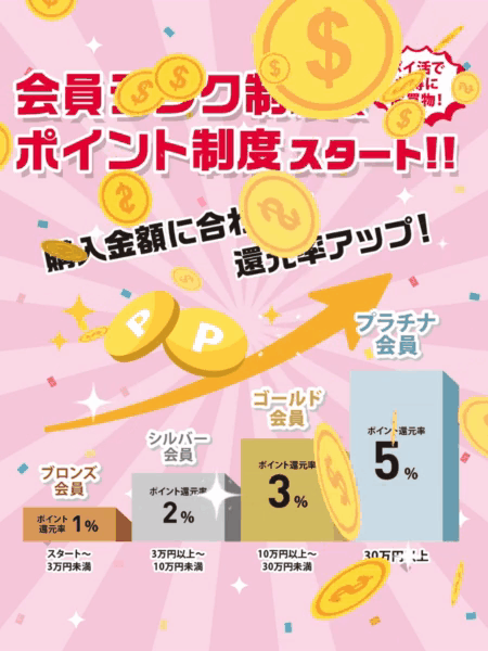 年間のお買い上げ金額によってポイント還元率最大6%と公式ショップを使えば使う程お得になるシステムとなっております♪