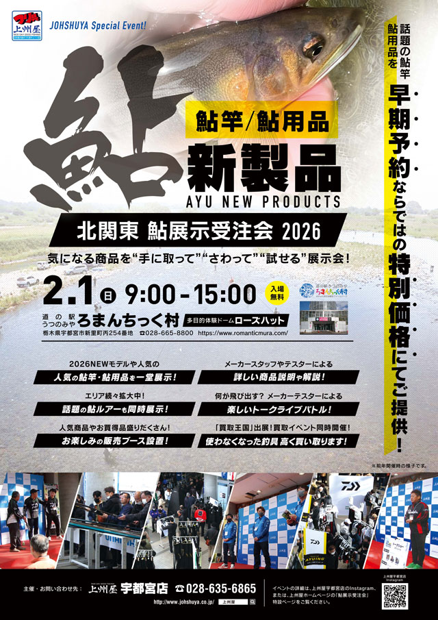2026年2月1日(日)9:00~15:00(予定)、栃木県宇都宮市ろまんちっく村ローズハットにて北関東 鮎 新製品 展示受注会2026を開催します!