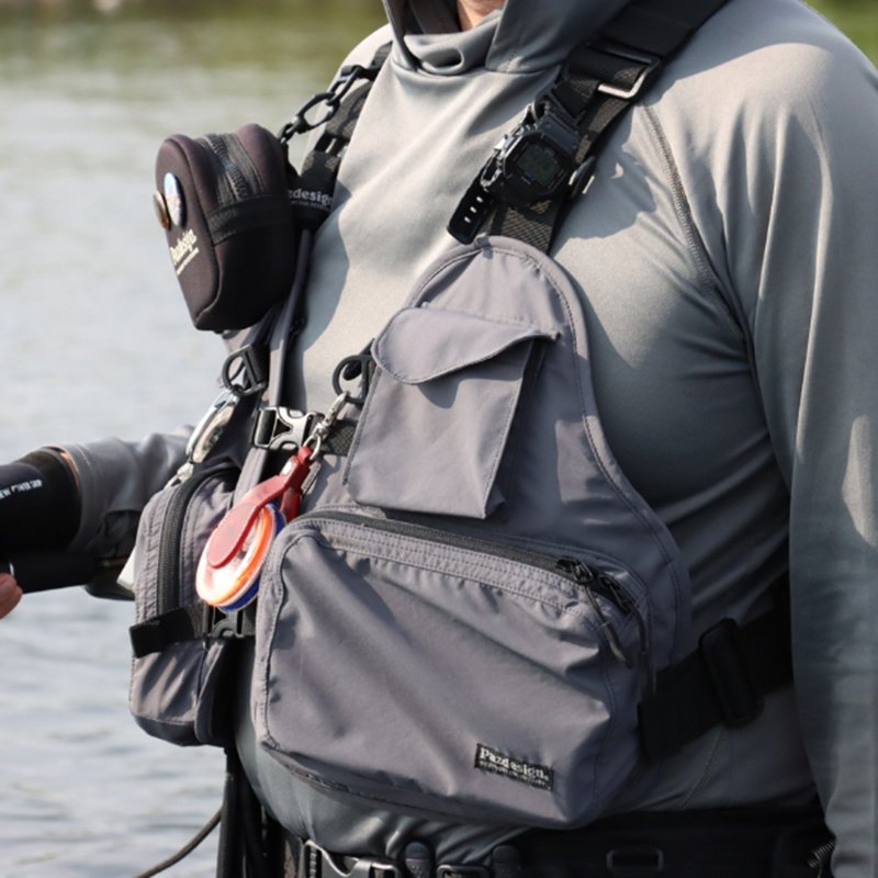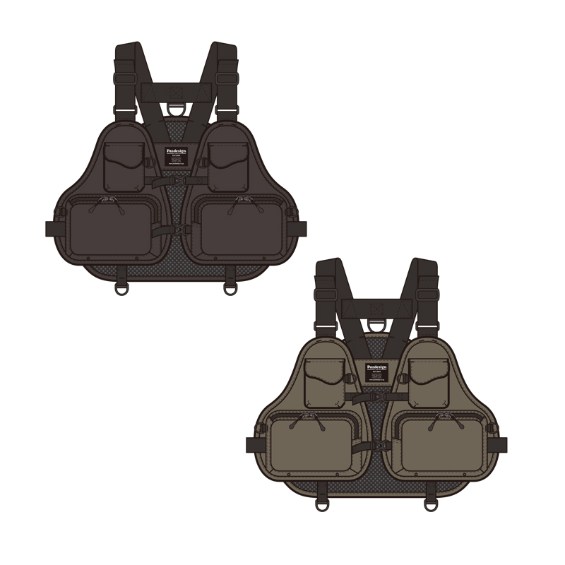 ショルダーベルトには特注仕様の『Dカン付きアジャスター』を採用。これにより今までのストラップベストでは難しかったチェスト部分へのポーチ類取り付けやすさが劇的に改善されました。